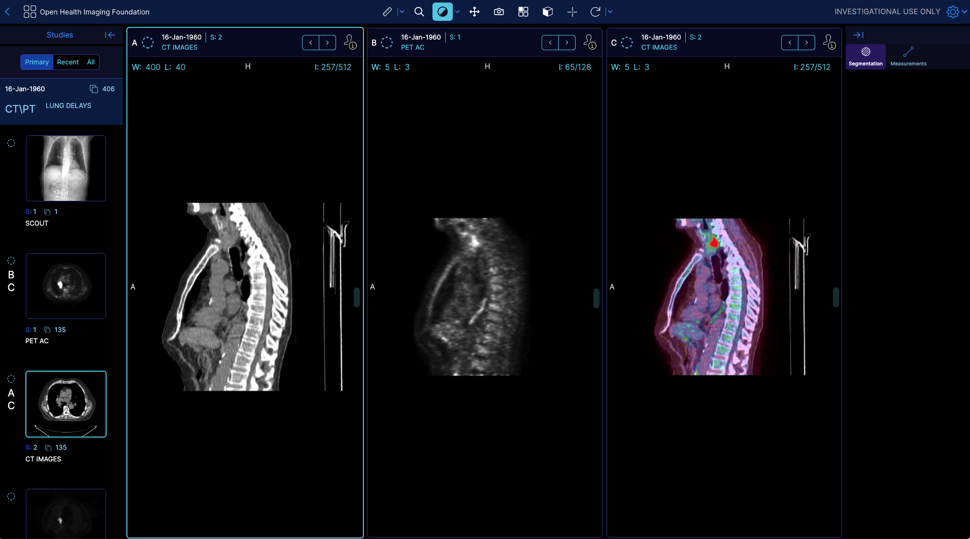 Often it is desired to match a new study to a prior study (e.g., follow up on a surgery). Since the hanging protocols run on displaySets we need to have a way to let OHIF knows that it needs to load the prior study as well. This can be done by specifying both StudyInstanceUIDs in the URL. The additional studies are then accessible to the hanging protocol. Below we are running OHIF with two studies, and a comparison hanging protocol available by default.